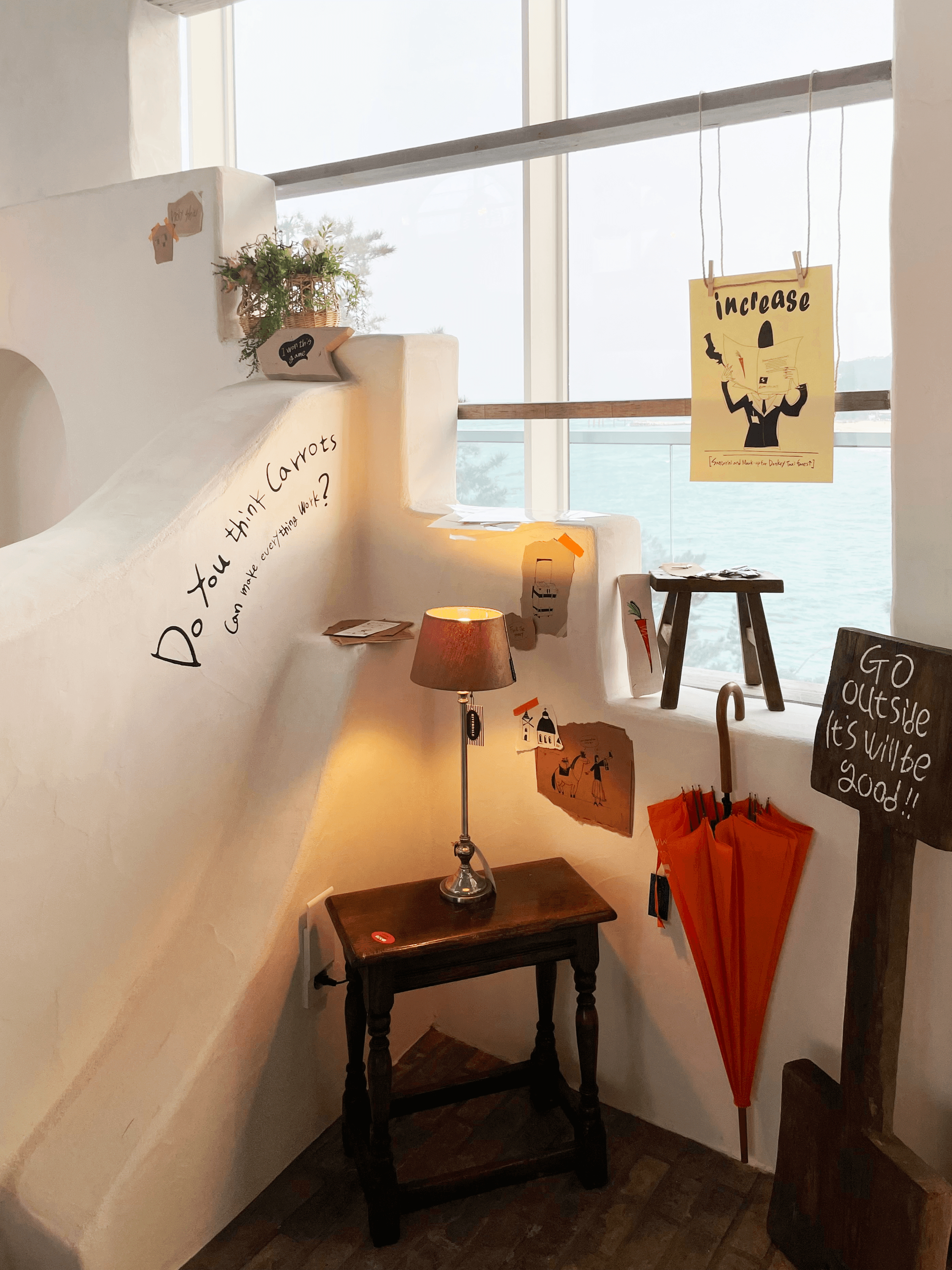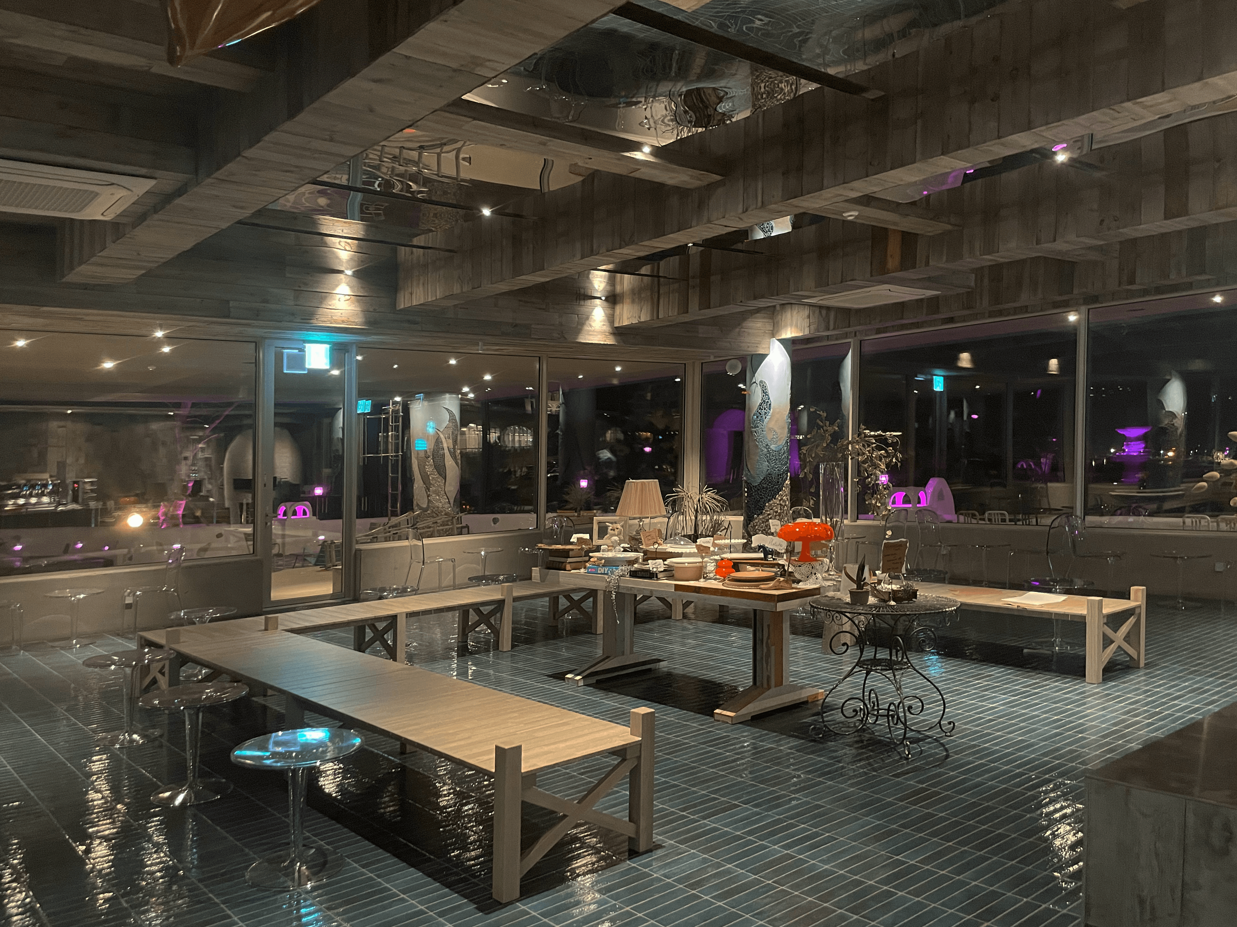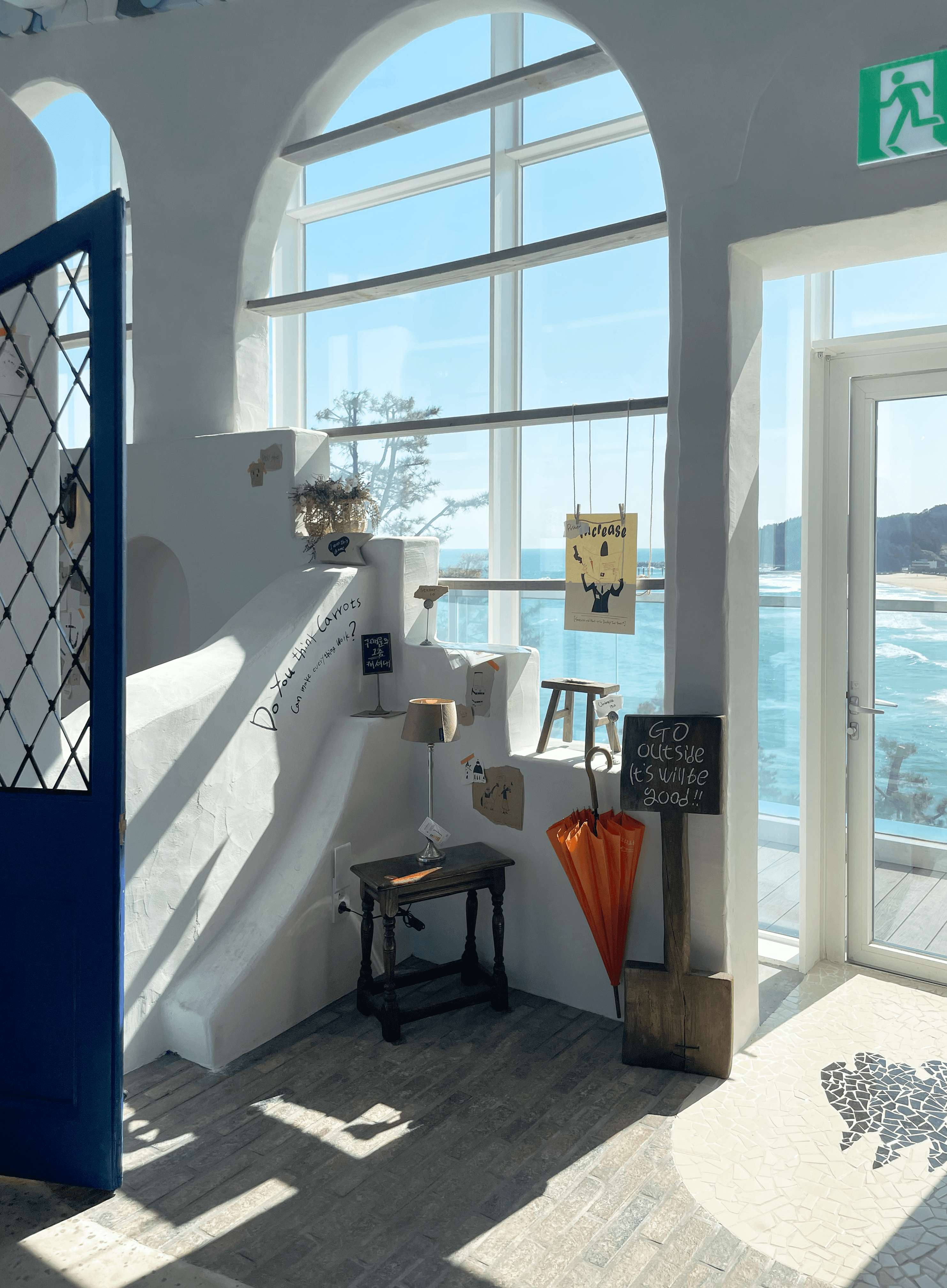 A warm and relaxing dining environment enhanced with natural textures, calm lighting, and the coastal ambience of Samcheok.