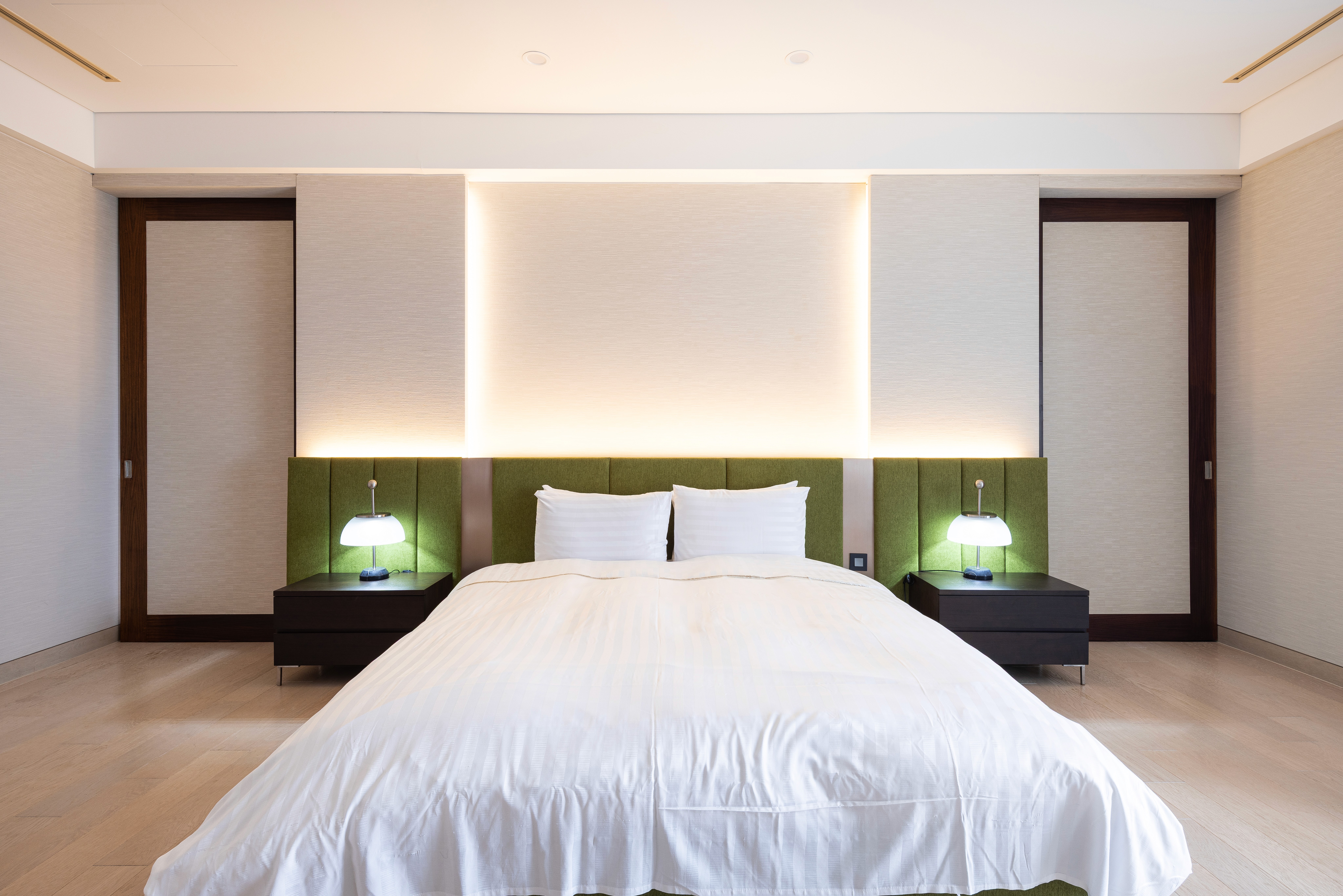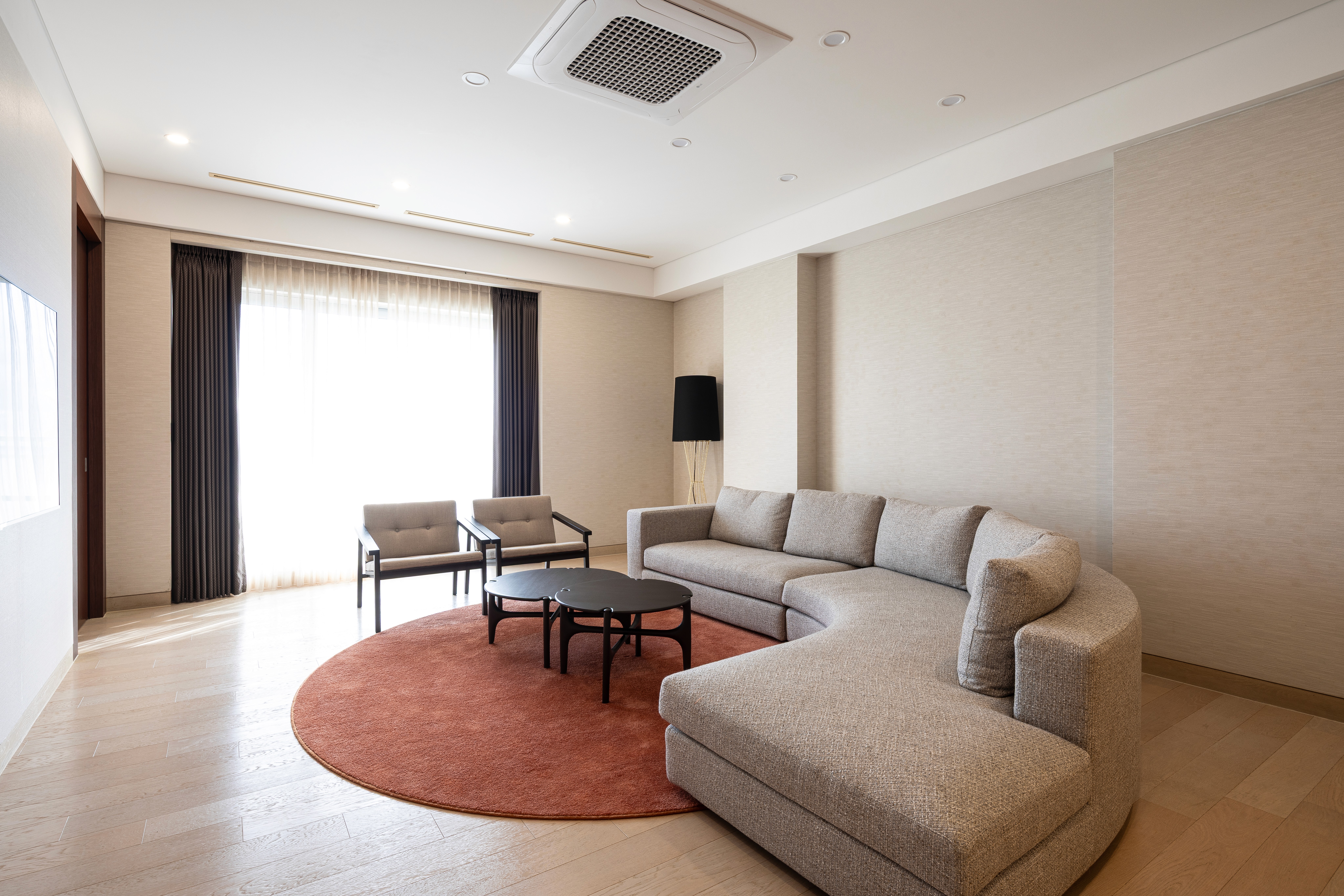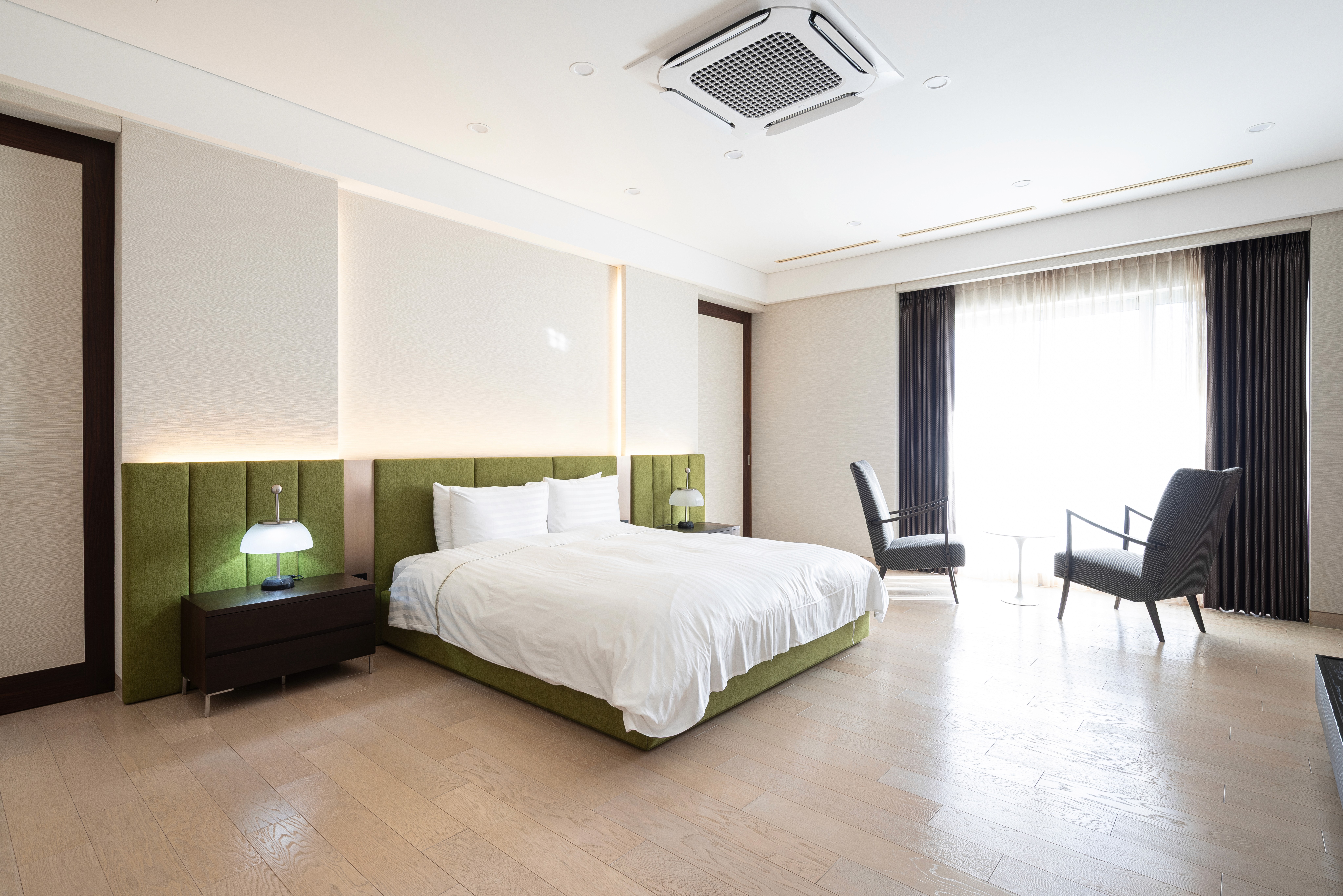 A luxurious Jeju suite designed with warm woods, stone textures, and serene minimalism inspired by Jeju’s natural scenery.